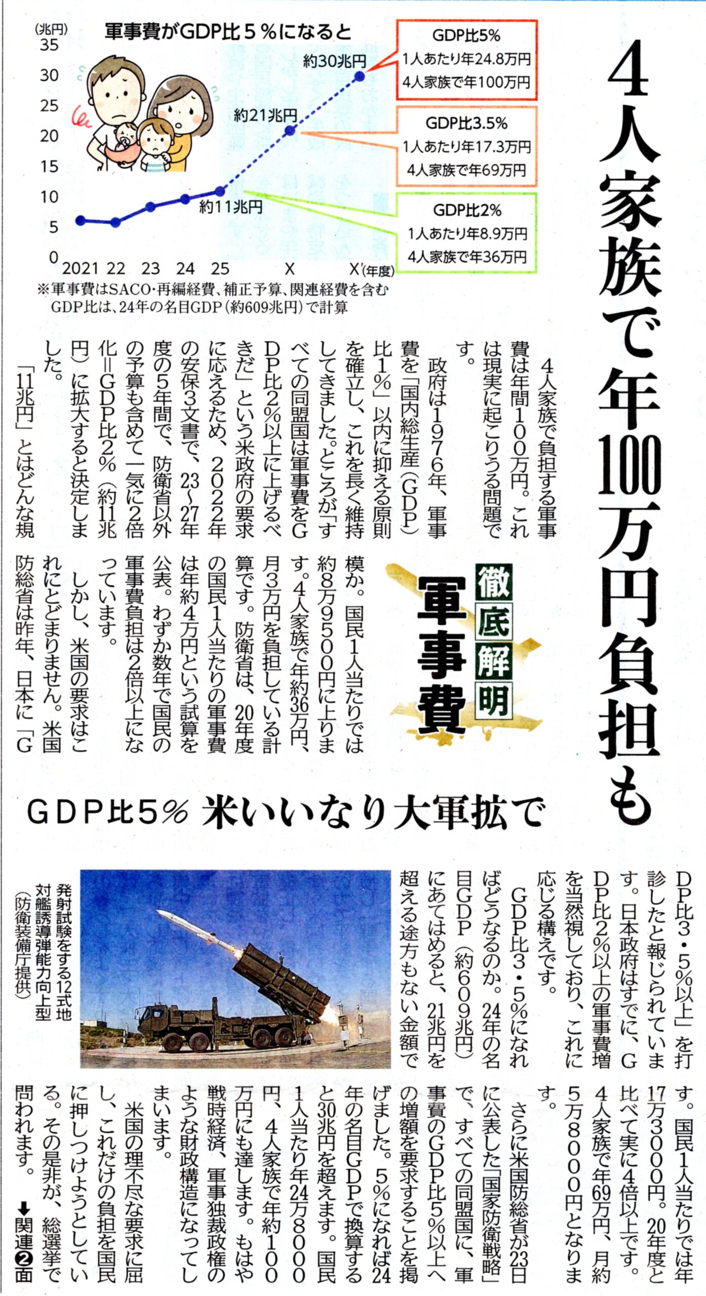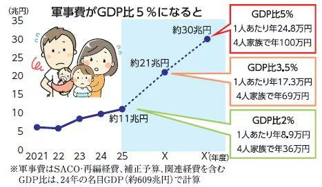 GDP比3・5%になればどうなるのか。24年の名目GDP(約609兆円)にあてはめると、21兆円を超える途方もない金額です。国民1人当たりでは年17万3000円。20年度と比べて実に4倍以上です。4人家族で年69万円、月約5万8000円となります。